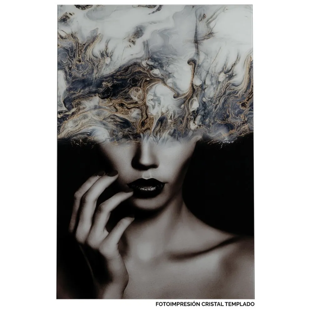 Cuadro en cristal templado con una imagen artística y abstracta de una mujer, ideal para añadir un toque contemporáneo y enigmático a cualquier ambiente. Incluye anclajes de metal para fácil instalación.