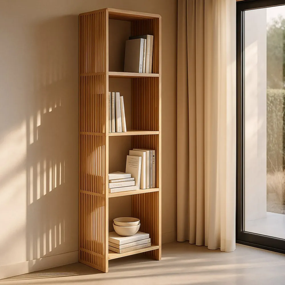 Material: Madera de teca reciclada. 4 huecos. 5 estantes.