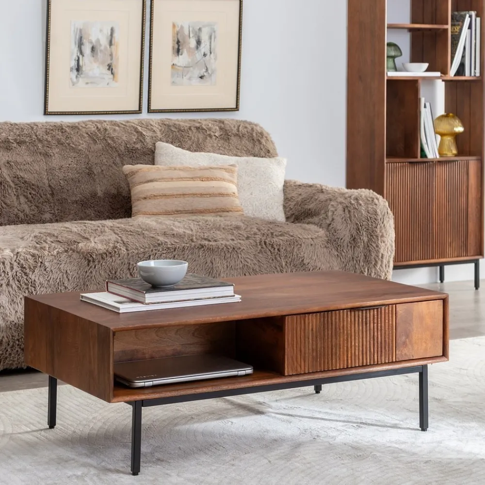 MESA CENTRO MADERA DE MANGO SALÓN 110 X 60 X 40 CM Material: madera de mango, hierro. Cajón: 55x17cm. Hueco: 53x17cm. Altura patas: 18cm.