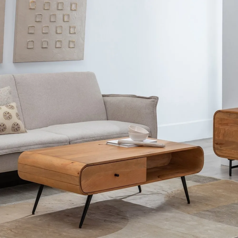 MESA CENTRO NATURAL MADERA DE MANGO 120 X 60 X 40 CM Material: madera de mango, hierro. Cajón: 58x16cm. Hueco: 58×16,5cm. Altura patas: 22cm.