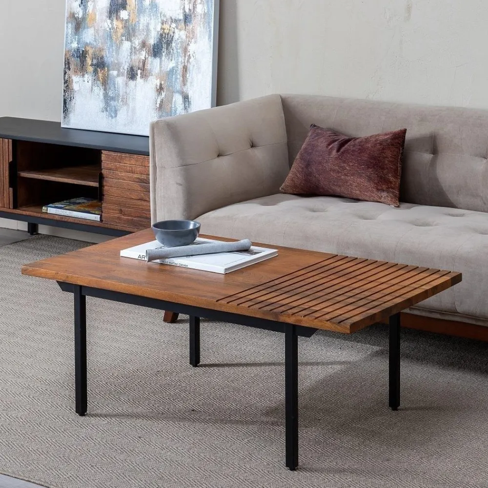 La mesa de centro Abner combina diseño contemporáneo y materiales de alta calidad, ideal para cualquier salón. Fabricada en madera de mango y metal, ofrece una superficie amplia y un estilo único.