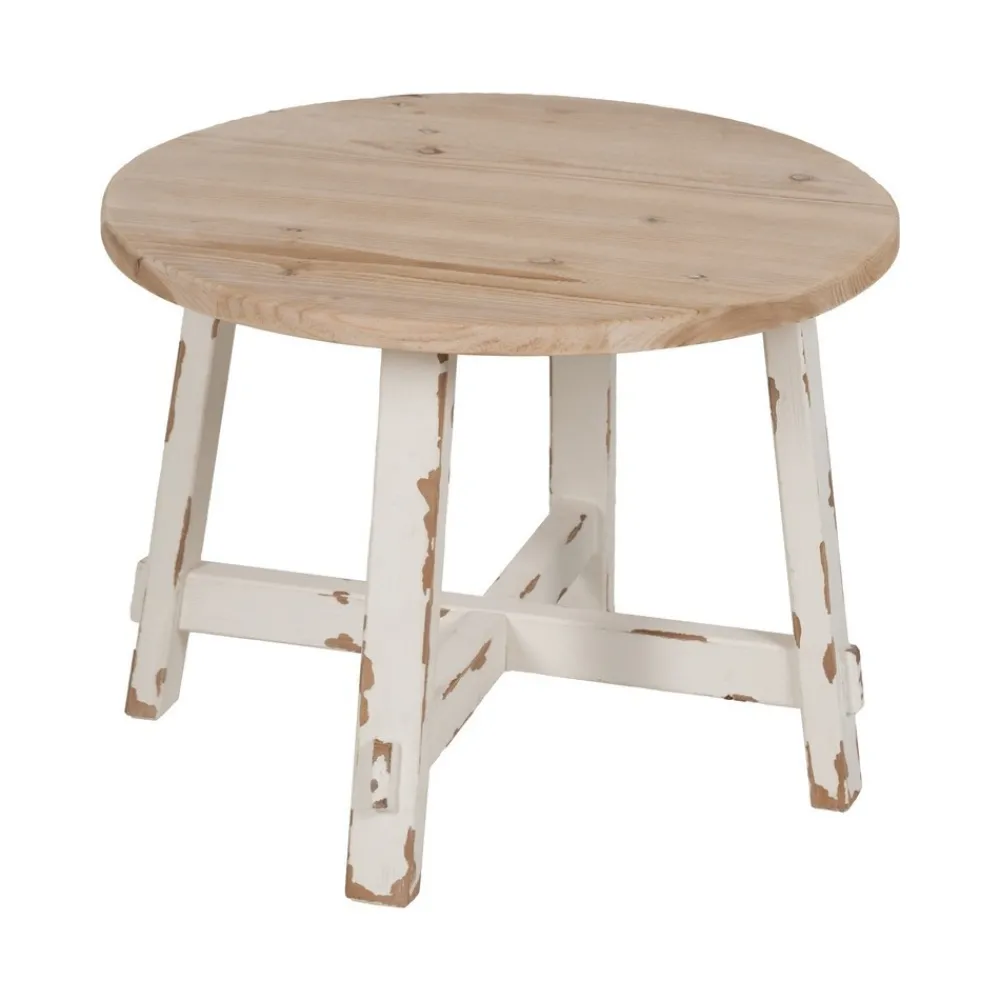 Esta mesa de centro redonda es perfecta para añadir un toque rústico a tu salón. Fabricada en madera de abeto con un acabado en color natural y blanco, es ideal para estilos vintage o shabby chic.