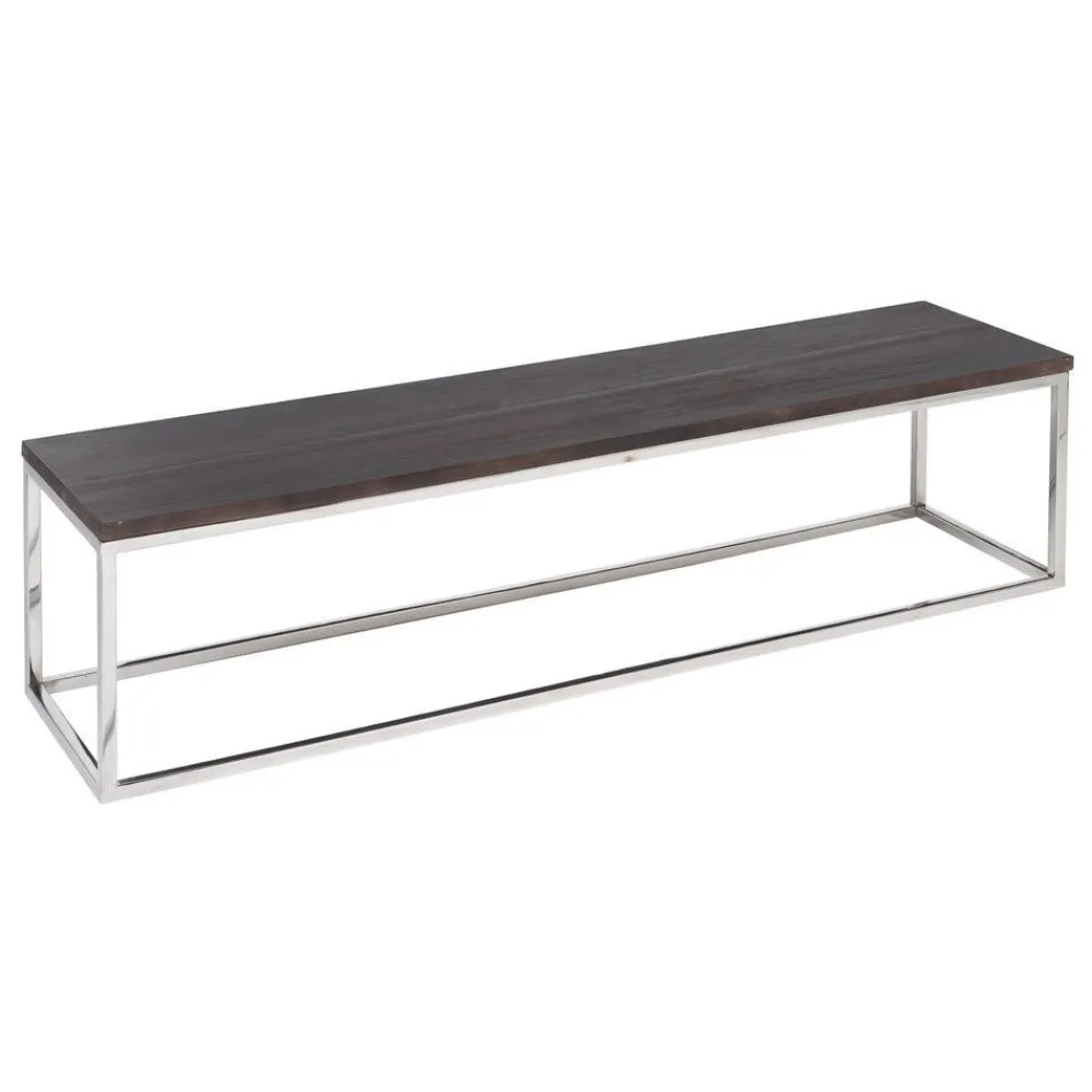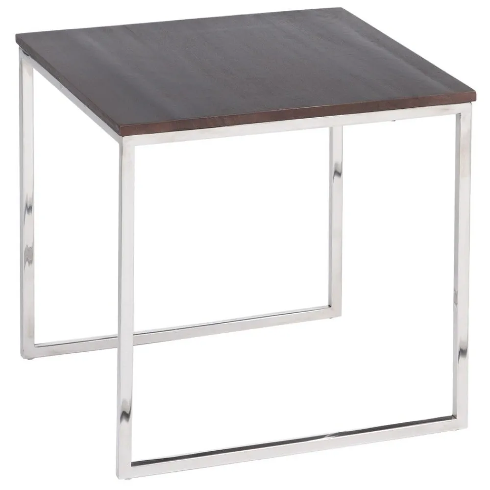 Conjunto de tres mesas nido, estructura de acero inoxidable color plata, encimera en madera de Mango color marrón.
