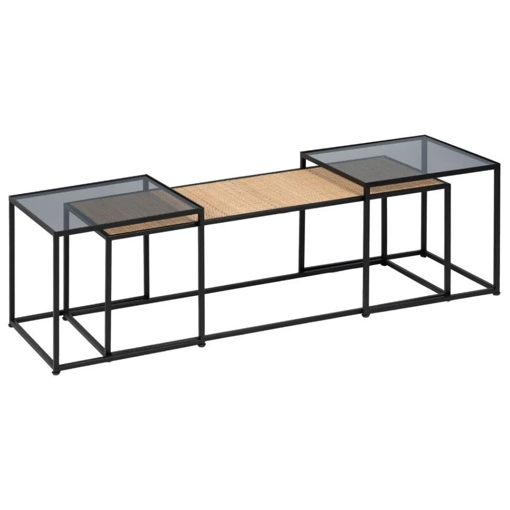 IXIA Mesas Auxiliares^Set De 3 Mesas De Centro De Ratán Y Cristal En Color Natural – Negro – Cristal 97,5 – 40 X 34,5 – 39 X 34 – 38 Cm