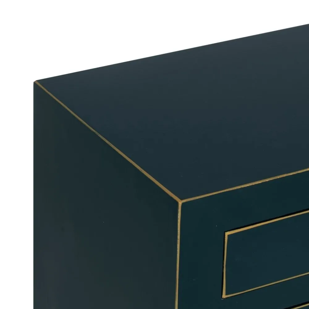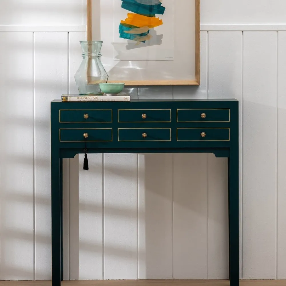 La consola Oriente azul es una pieza decorativa que combina madera de abeto y DM con acabados dorados en los bordes y pomos envejecidos. Sus 6 cajones funcionales y su diseño simétrico la convierten en el complemento perfecto para recibidores, salones o dormitorios con estilo oriental. No requiere montaje.