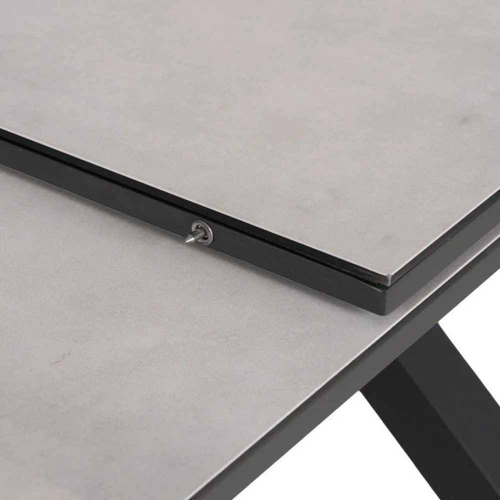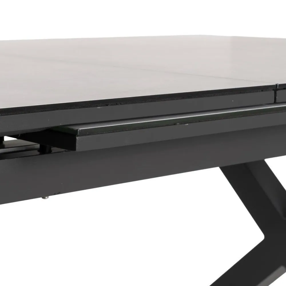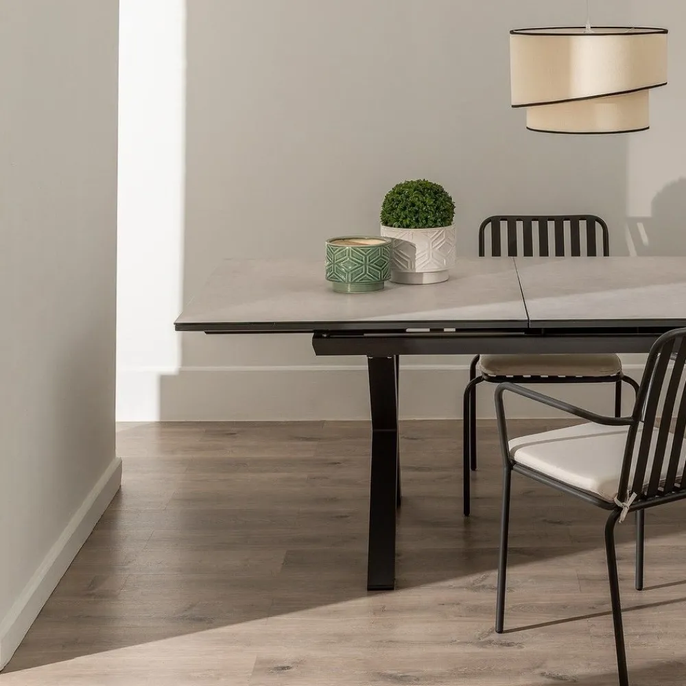La mesa de comedor extensible cerámica combina un diseño contemporáneo con la funcionalidad de una encimera extensible. Su superficie de cristal con cerámica ofrece resistencia y elegancia, mientras que las patas de aluminio negro aportan estabilidad y carácter. Ideal para 6 a 10 comensales, perfecta para reuniones y eventos.