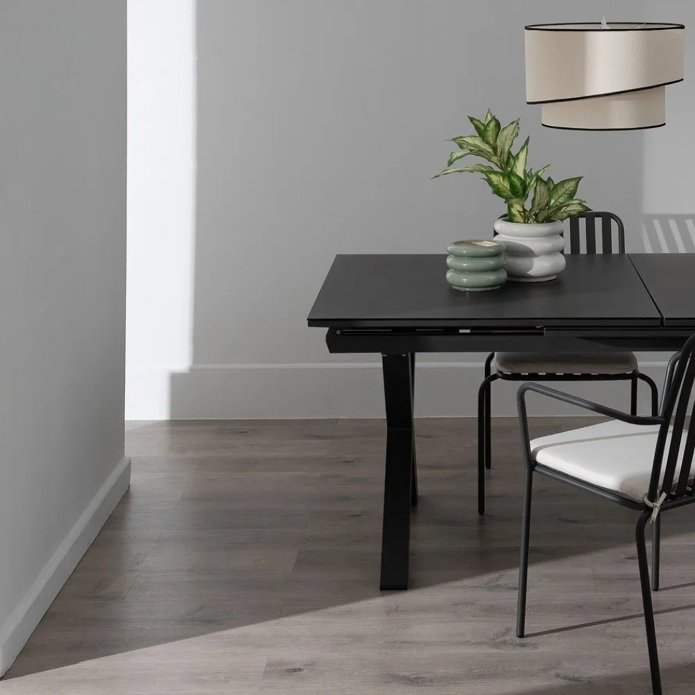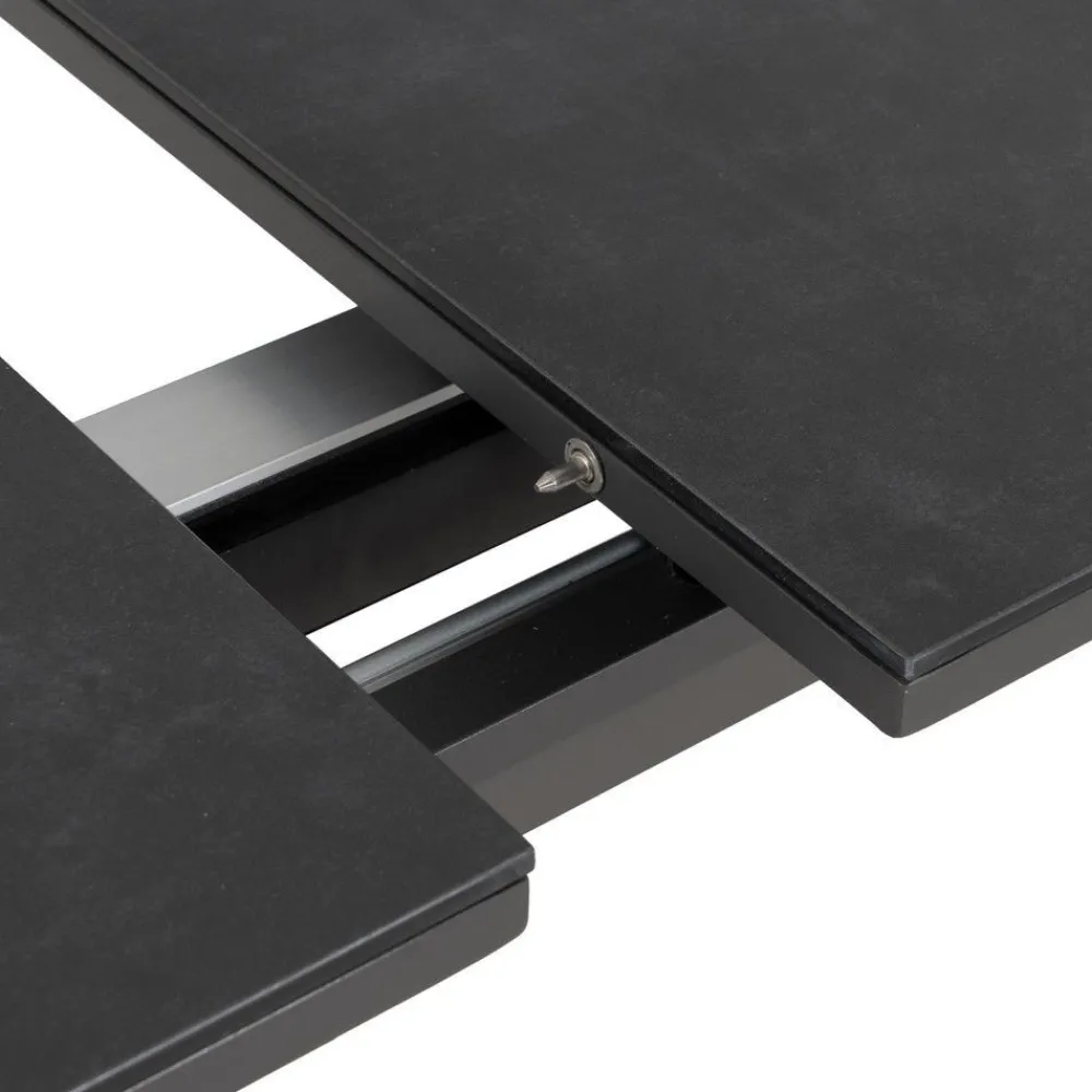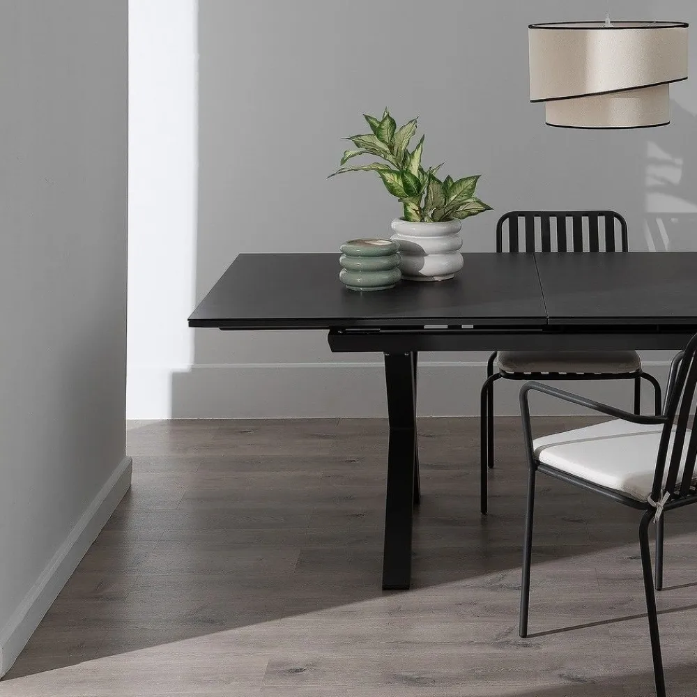 La mesa de comedor extensible antracita combina elegancia y funcionalidad gracias a su encimera de cristal recubierto de cerámica y su sistema extensible. Ideal para 6 a 10 comensales, se adapta a cualquier espacio y ocasión con un diseño contemporáneo y sofisticado.