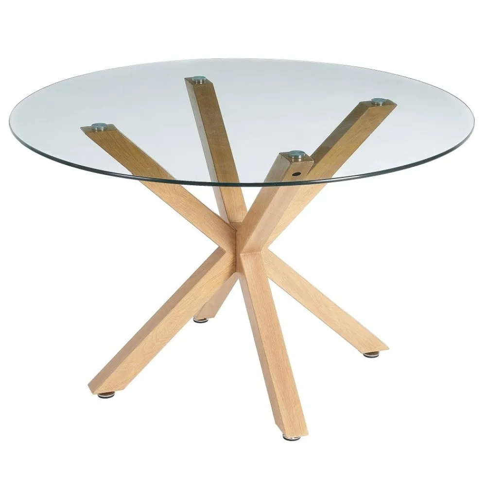 La mesa redonda de cristal combina diseño moderno y practicidad. Su tablero de cristal templado de 10 mm y patas de metal en color natural crean una estética ligera y elegante, perfecta para comedores contemporáneos.