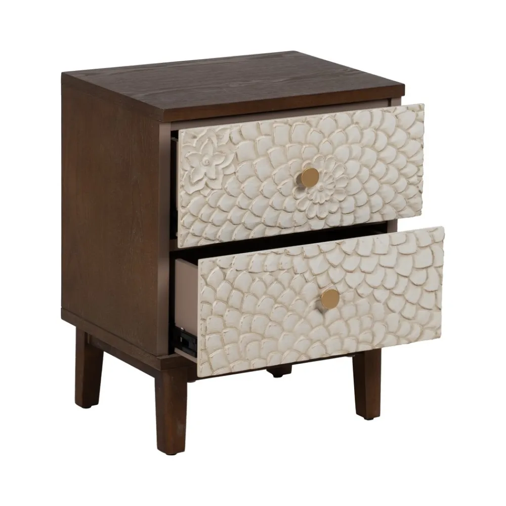 Mesita de Noche de Madera Tallada con 2 Cajones – Estilo Rústico y Funcional