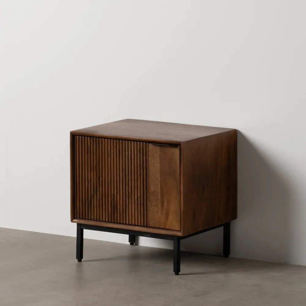 MESITA MADERA DE MANGO DORMITORIO 50 X 40 X 50 CM Material: madera de mango, hierro. Puerta: 46x32cm. Altura patas: 13cm.