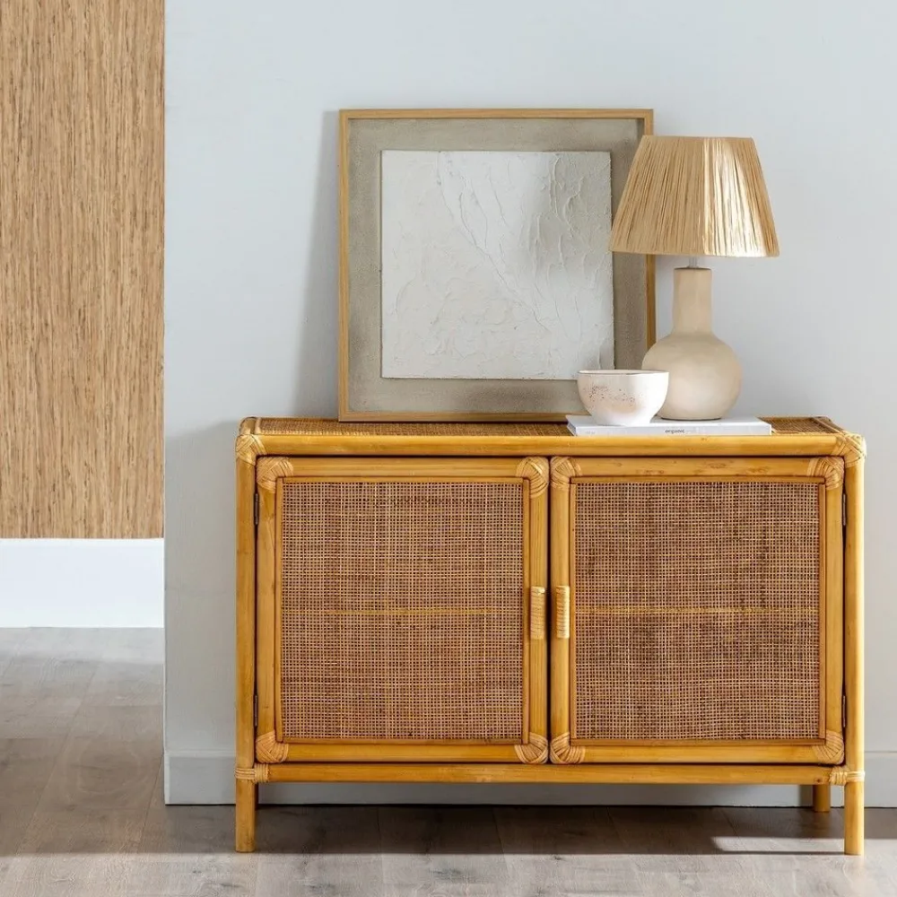 Mueble auxiliar de ratán natural con dos puertas – Elegancia y funcionalidad para tu hogar