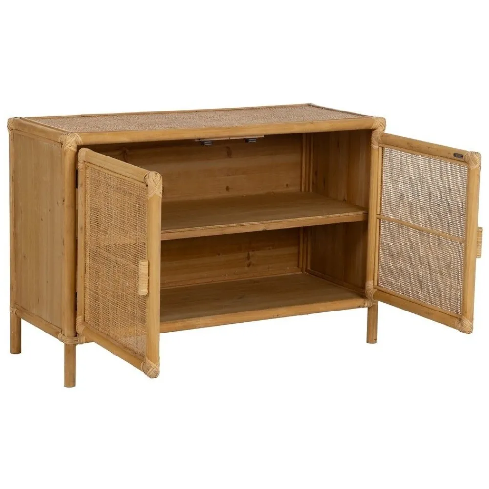 Este encantador destaca no solo por su estética natural, sino también por su funcionalidad. Con dos puertas de ratán tejido, permite almacenar discretamente objetos y mantener el orden en cualquier estancia. Su acabado en color natural y la textura única del ratán lo convierten en una pieza ideal para decoraciones de estilo rústico, bohemio o incluso nórdico.