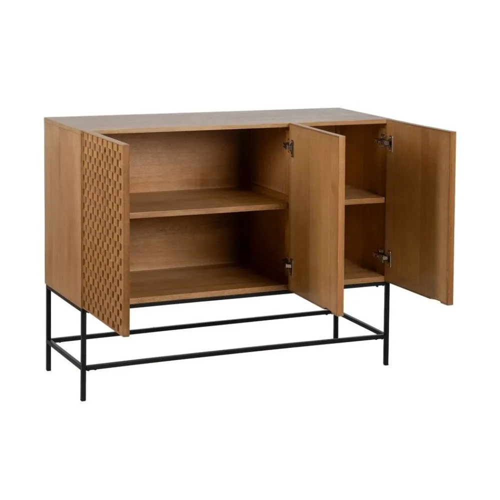 El aparador Marigni destaca por su combinación de materiales de alta calidad y un diseño cuidadosamente elaborado. Las tres puertas, con un acabado en vinilo de madera de fresno, aportan calidez y elegancia, mientras que las patas de metal en color negro proporcionan estabilidad y un toque industrial. Este aparador es perfecto para almacenar y organizar diversos objetos, manteniendo el orden y la estética en cualquier habitación.