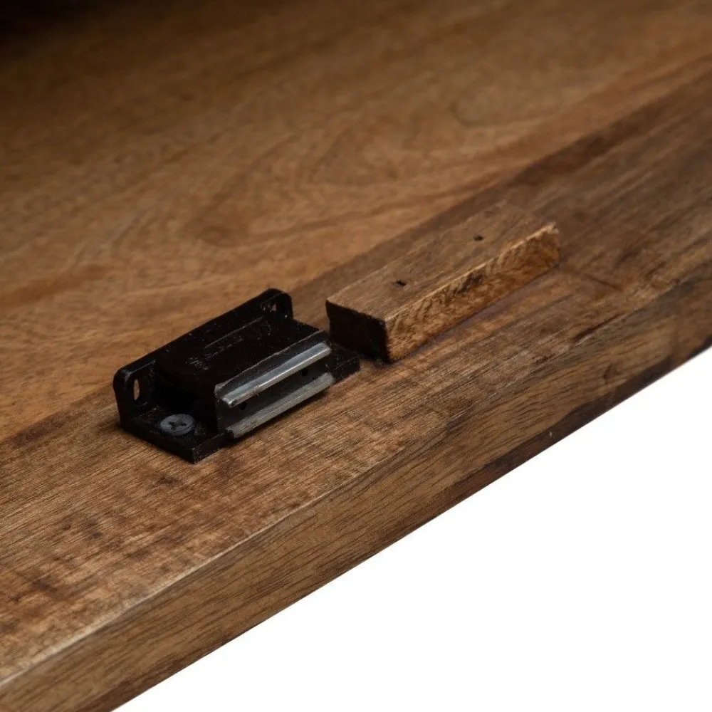 Aparador de madera de mango en color natural, con cuatro puertas de capilla con vitrina de cristal transparente. Un aparador de estilo rústico que destacará en ambientes modernos.