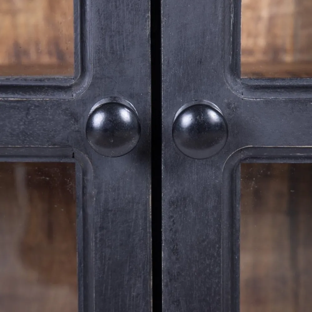 Aparador de cuatro puertas vitrina en color negro y natural, fabricado en madera de mango, dispone de ruedas para un fácil desplazamiento.