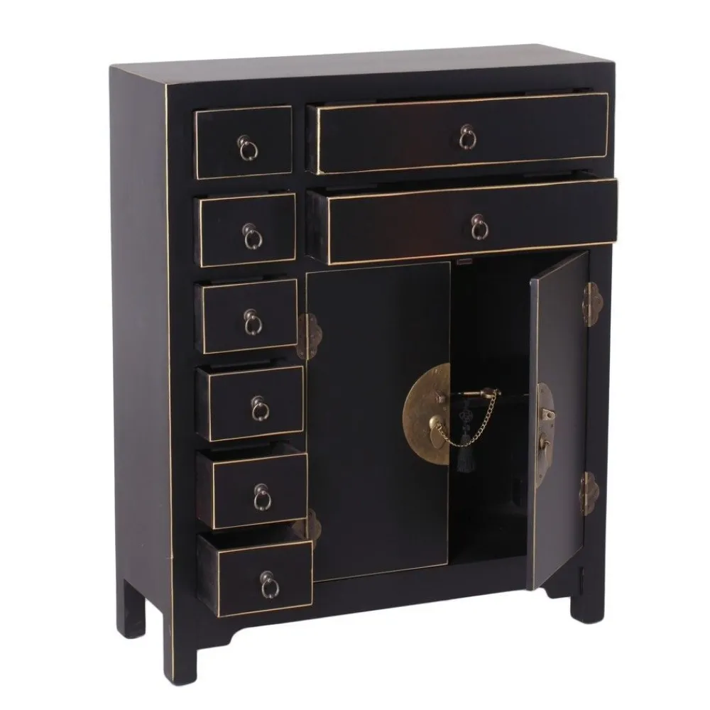 Mueble para recibidor auxiliar, de estilo oriental en negro con detalle oro. Dispone de una hilera de 6 cajones pequeños en la parte izquierda y dos cajones y dos puertas en la parte derecha.