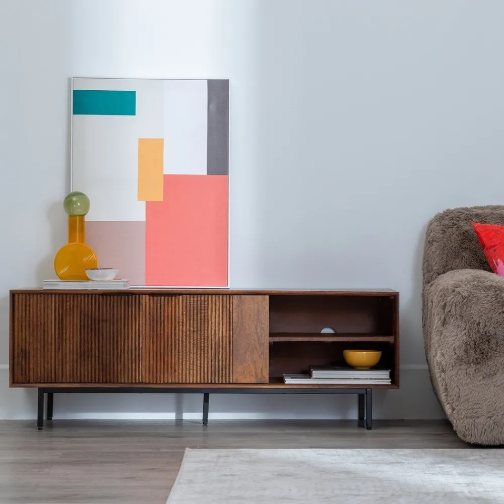 MUEBLE TV MADERA DE MANGO SALÓN 140 X 40 X 50 CM Material: madera de mango, hierro. Puertas: 46x32cm. Huecos: 46x15cm. Altura patas: 13cm.