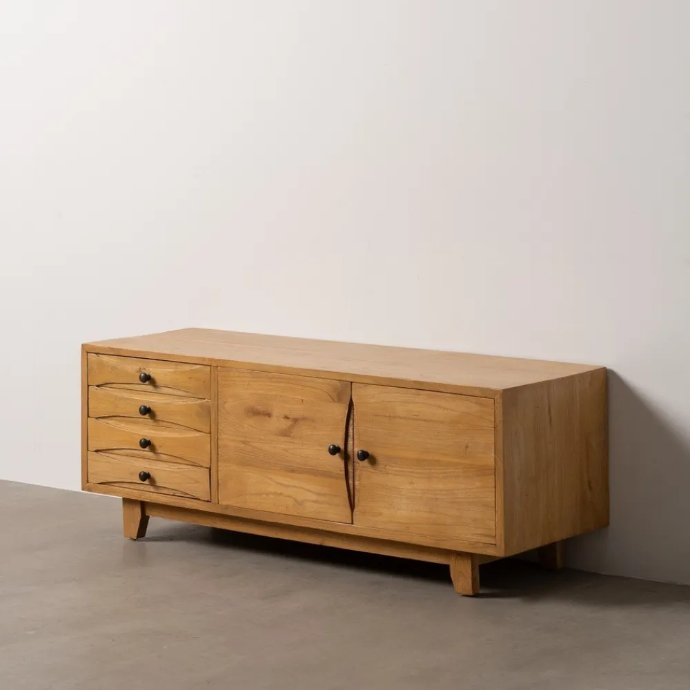 MUEBLE TV NATURAL MADERA MINDI SALÓN 120 X 40 X 45 CM Material: madera de mindi. Cajones: 38×7,5cm. Puertas: 37,5x31cm. Altura patas: 11cm.