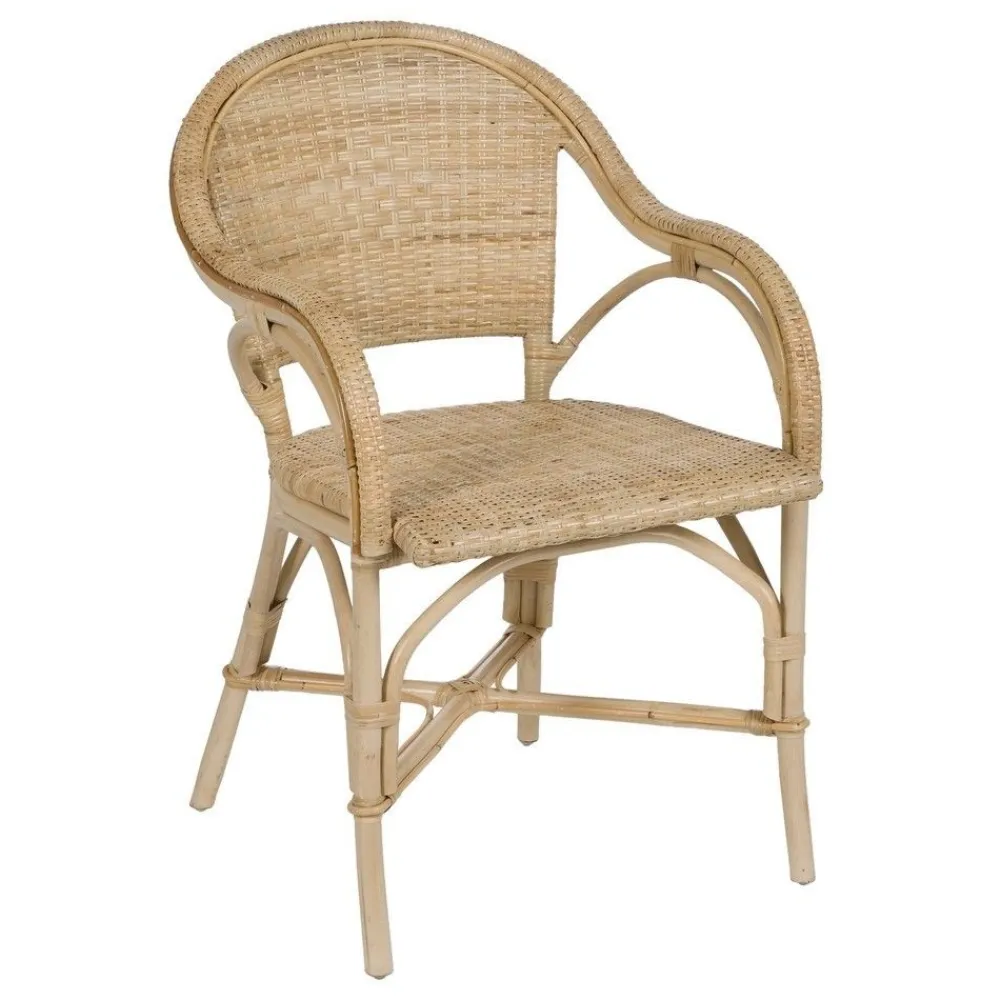 - Silla de ratán con brazos: 55 cm (ancho) x 84 cm (alto) x 60 cm (fondo).