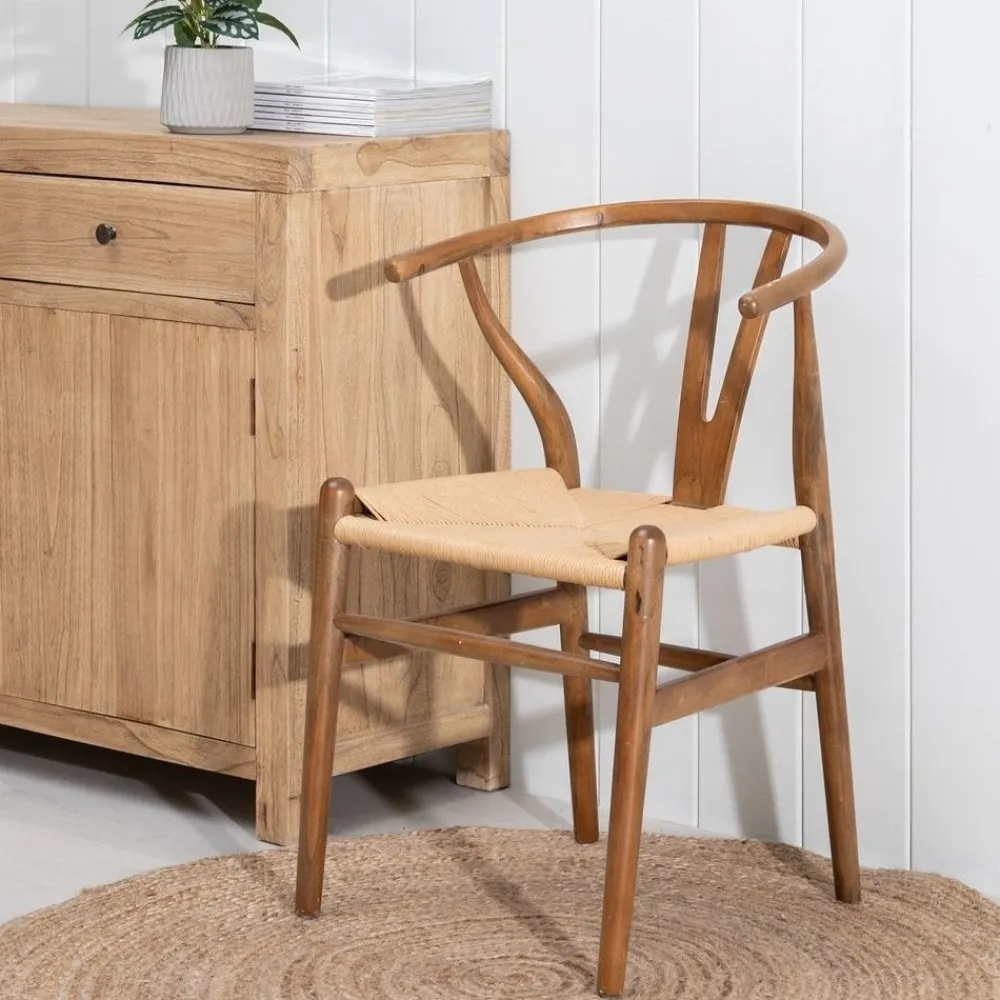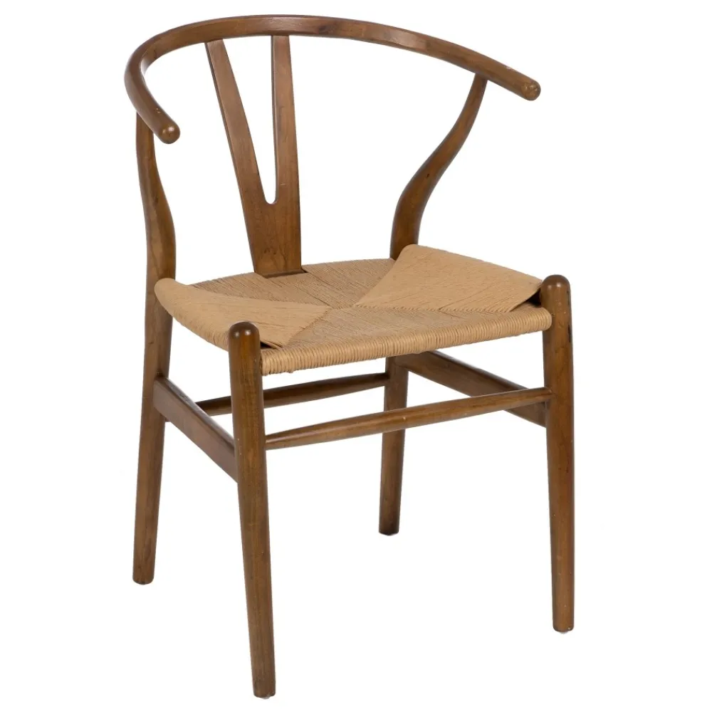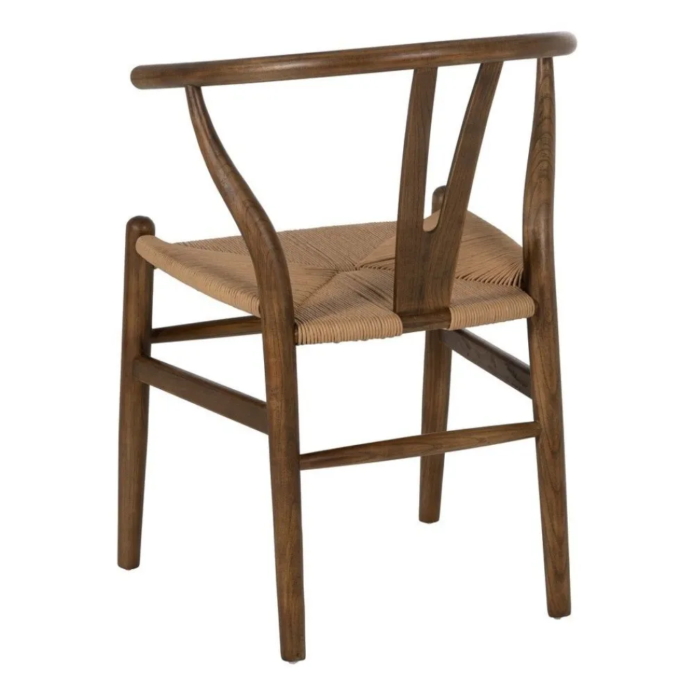 La silla de madera de olmo en color marrón, con asiento de ratán, es perfecta para cualquier salón o dormitorio. Su diseño clásico y resistente proporciona comodidad y estilo, ideal para ambientes rústicos y modernos.