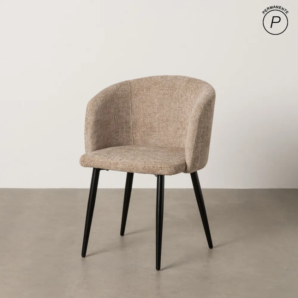 Material: Tejido – Metal. Tapizado: 100% Poliéster. Color del tapizado: Beige. Color de las patas: Negro. Relleno: Foam. Densidad: 24 kg/m3. Material de las patas: Metal. Altura del asiento: 46 cm. Altura del respaldo: 32 cm . Anchura del asiento: 44 cm. Profundidad del asiento: 43,5 cm. Altura del respaldo: 39 cm. No apilable. Peso máximo soportado: 120 kg. Cumple normativa EN16139.