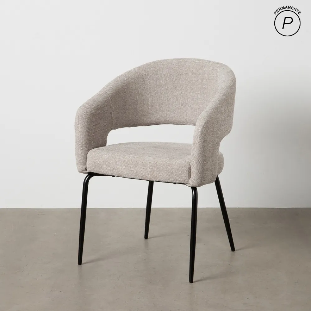 Material: Tejido -Metal. Tapizado: Poliéster. Color del tapizado: Taupe. Color de las patas: Negro. Relleno: Foam. Densidad del relleno: 28 kg/m3. Material de las patas: Hierro. Altura del asiento: 48 cm. Altura de las patas: 42 cm. Altura del respaldo: 36,5 cm . Distancia entre las patas: 57 cm. Altura de los brazos: 64cm. Peso máximo soportado: 140 kg. No apilable. No necesita montaje. Cumple normativa EN16139:2013 (Catering).