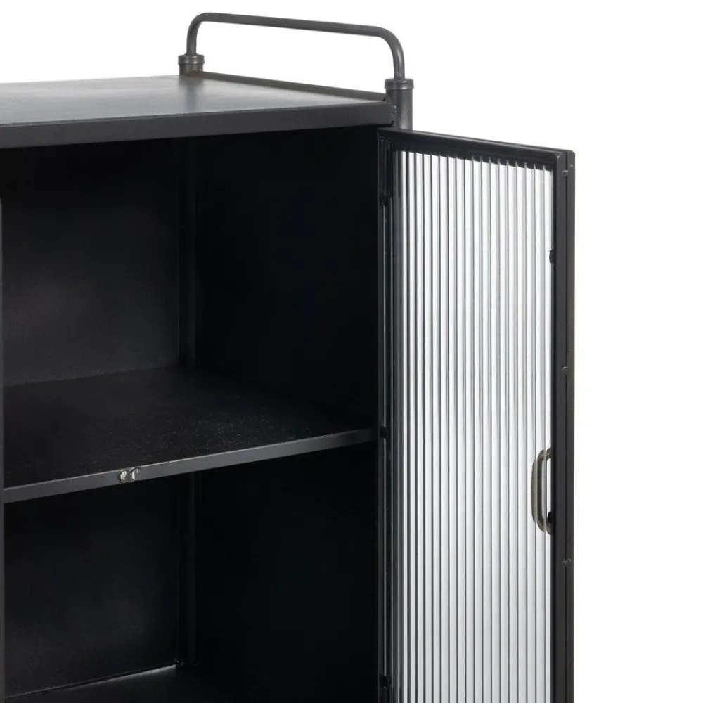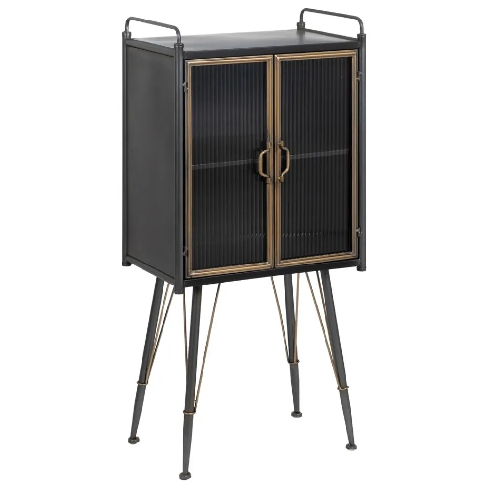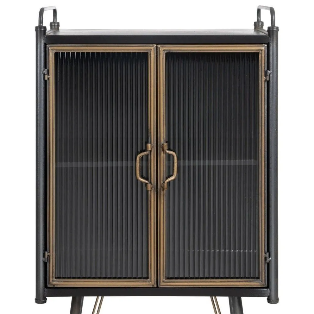 La vitrina auxiliar Brick es perfecta para añadir un toque moderno e industrial a tu hogar. Fabricada en hierro negro con detalles en oro envejecido y puertas de cristal texturizado, combina elegancia y funcionalidad.