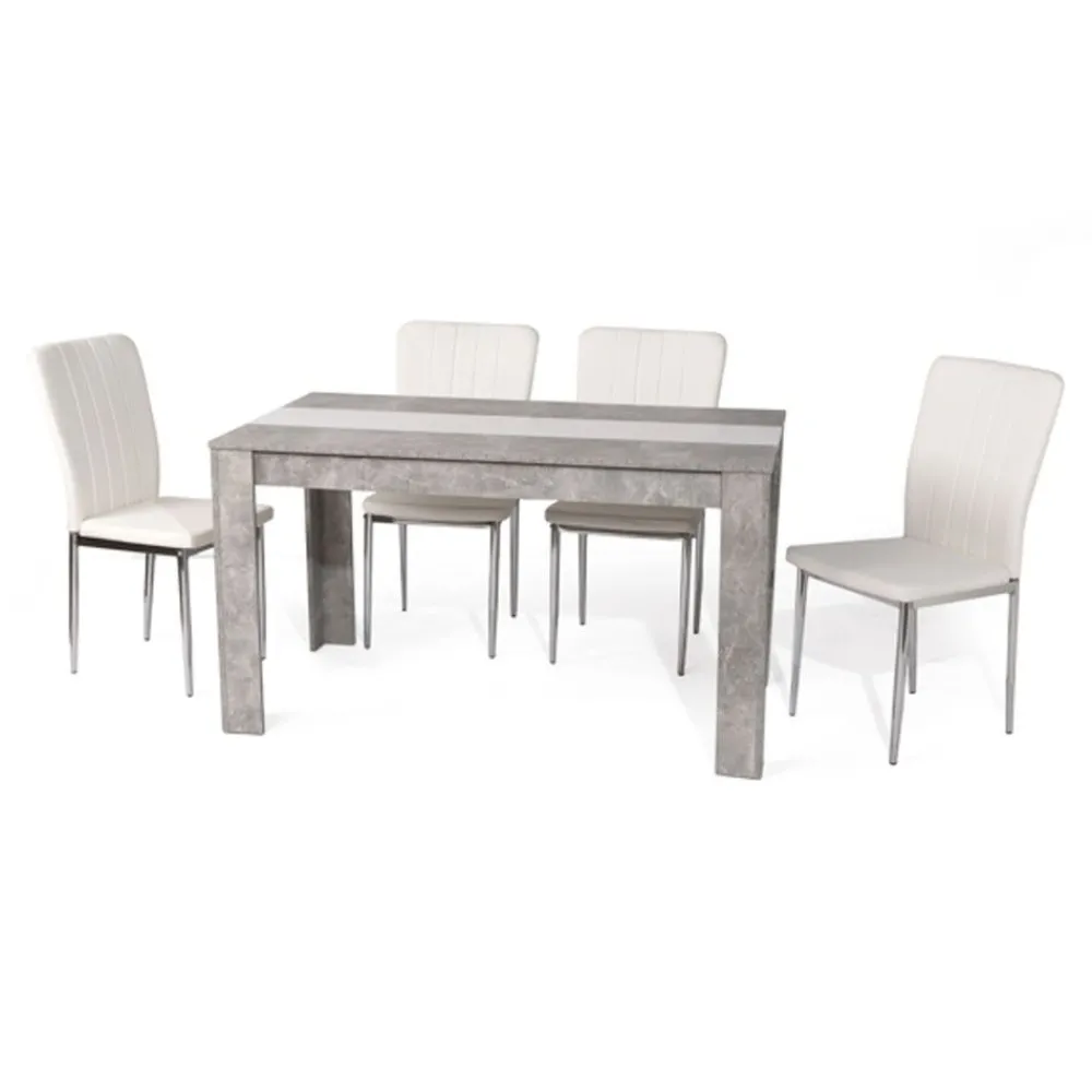 Mesa de salón en MDF color cemento y blanco, sillas con patas metálicas, asiento acolchado y tapizado en PU blanco