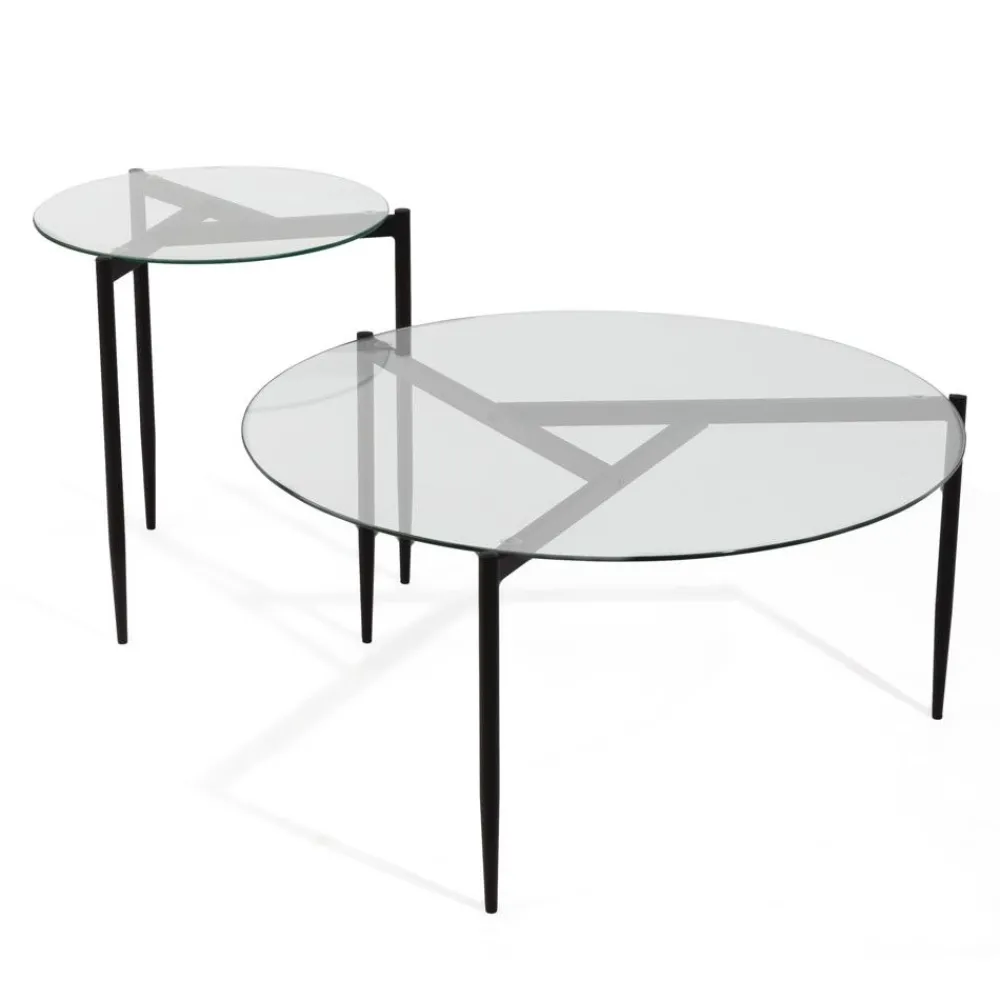 Conjunto de dos mesas de centro redondas con encimera de cristal templado transparente de 5 mm grosor, las patas son metálicas en color negro.