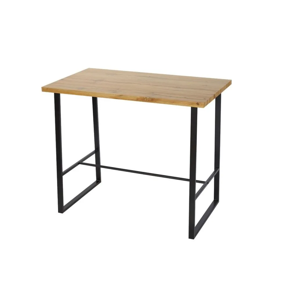 Mesa alta para cocina con encimera fabricada en tablero de MDF de 35 mm de grosor y recubierta en melamina de color roble, su estructura y sus patas son metálicas en color negro, para darle mayor estabilidad.
