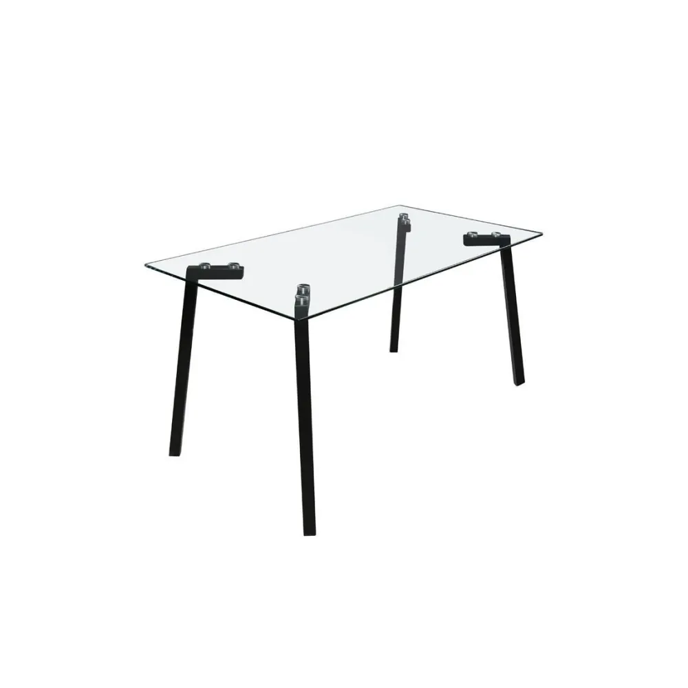 Una mesa de comedor con tapa de cristal templado transparente de 8 mm de grosor y patas metálicas en color negro, una mesa elegante para salones modernos o clásicos, la puedes acompañar con cualquier silla del catálogo de fanmuebles.