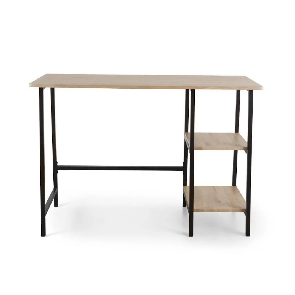 La mesa de estudio Sendai combina un diseño contemporáneo con funcionalidad. Fabricada en MDF con acabado roble y estructura metálica negra, cuenta con dos baldas a la derecha para optimizar tu organización.