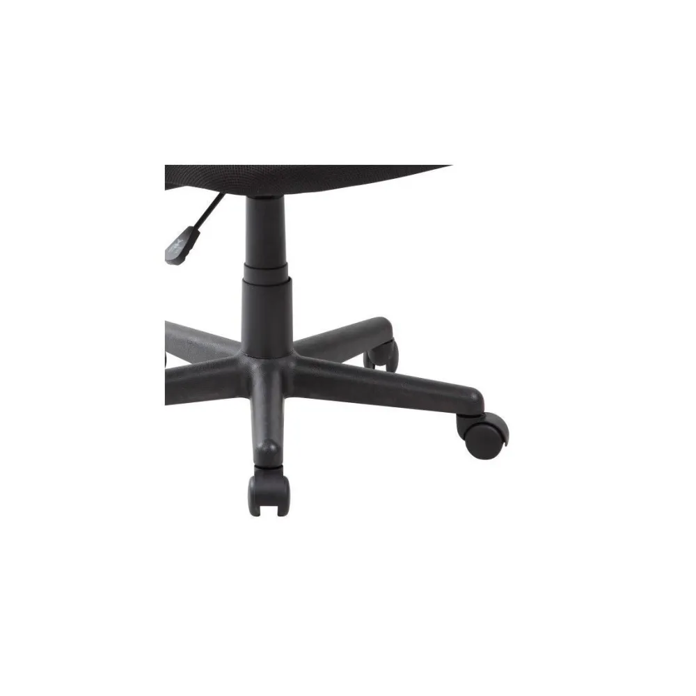 Una silla de escritorio tapizada en tejido 3D negro para el respaldo, asiento acolchado tapizado en color negro, sistema hidráulico elevador que aumenta la altura del asiento hasta 10 cm para que llegues mejor a la mesa de oficina o escritorio. Con pata en forma de araña acabadas en ruedas para que deslice suavemente por la habitación.