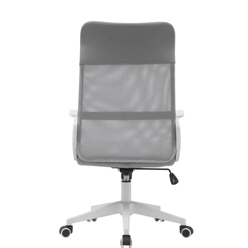 El respaldo de la silla, tapizado en tejido 3D gris, asegura una excelente transpiración, manteniendo una sensación fresca y cómoda incluso en las jornadas más largas. El reposacabezas, tapizado en PU gris, proporciona un soporte adicional, cuidando la postura y evitando tensiones en el cuello y los hombros.