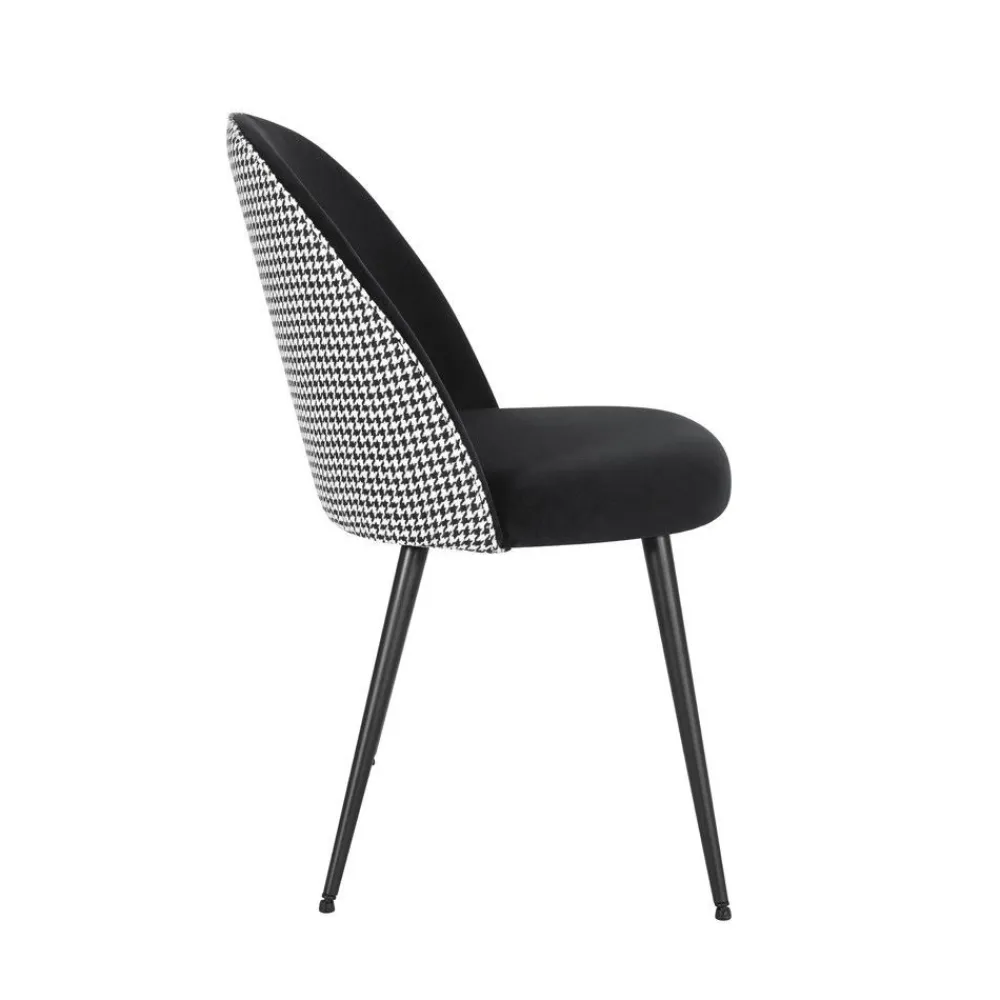 Confortable silla para salón comedor tapizada en tela Velvet color negro en la parte frontal y con estampado pata de gallo en la trasera
