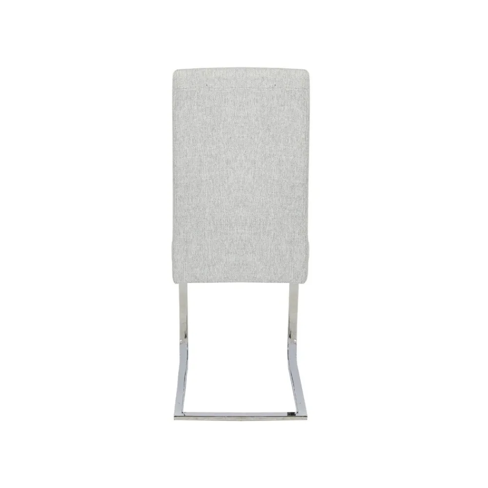 La silla para salón comedor Camila con asiento y respaldo acolchado y tapizado en tela color gris claro es una silla muy confortable. Combínala con la mesa de comedor que más te guste para completar tu salón. Patas metálicas en forma de U color cromo