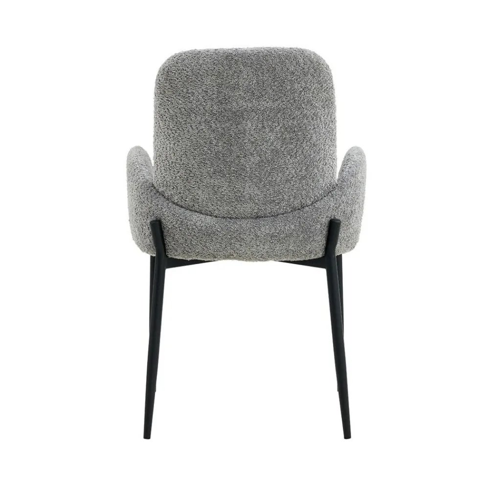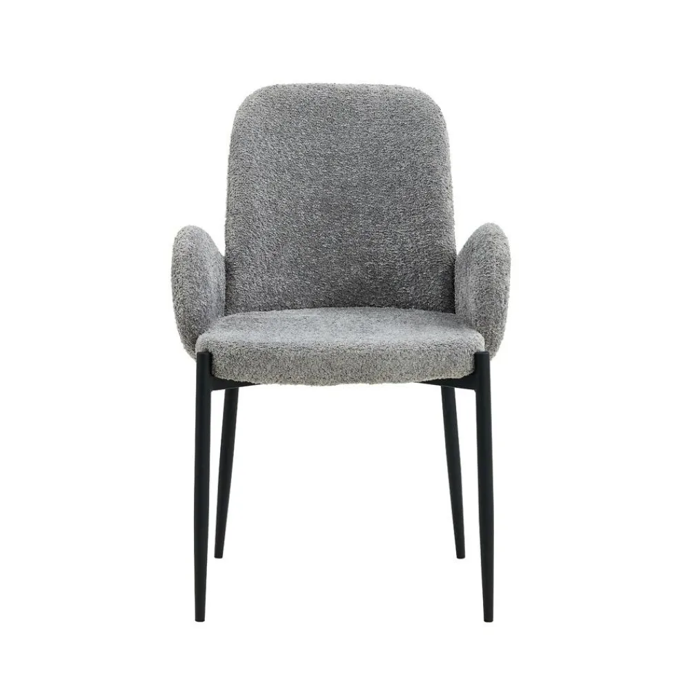 Silla de salón con reposabrazos, acolchada y tapizada con una tela color gris tipo Teddy, que recuerda la textura de un osito de peluche. Destaca por la forma de sus patas metálicas en color negro.