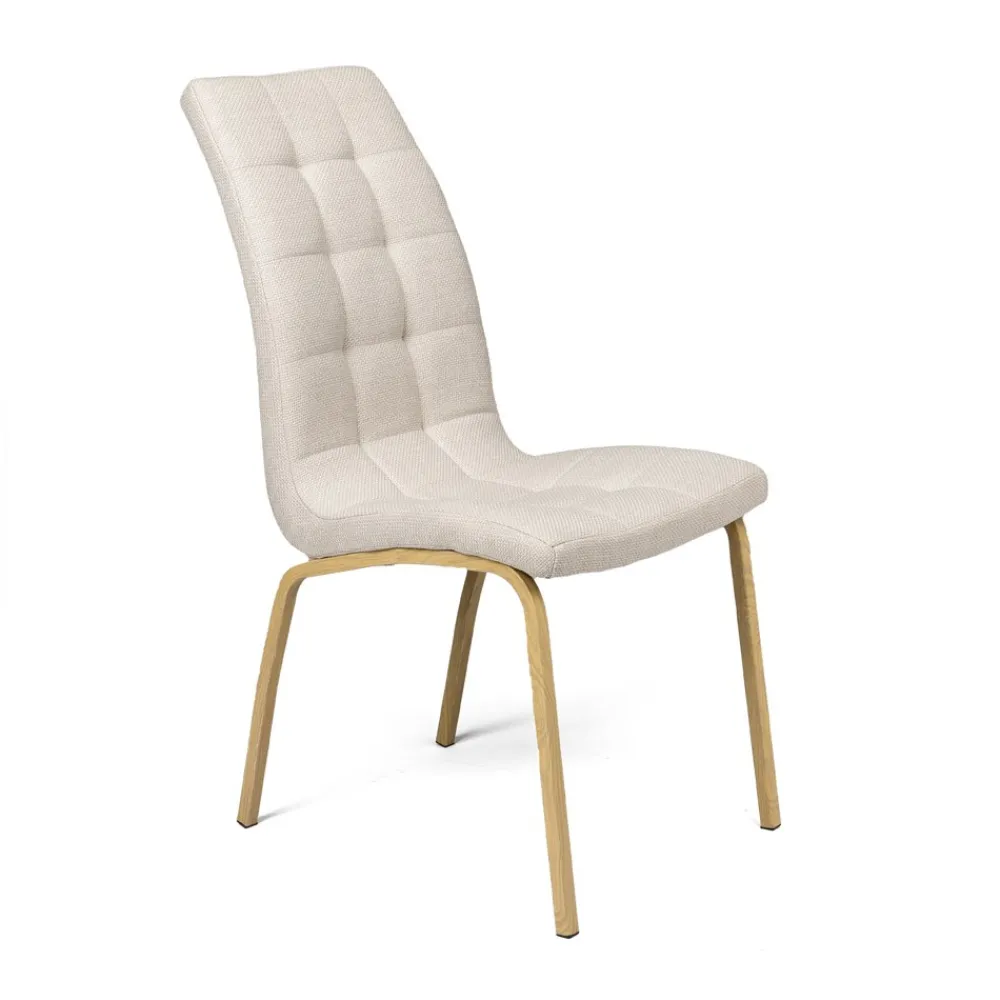 La silla de comedor Jade destaca por su tapizado en tela beige de alta calidad y patas metálicas con acabado madera, ofreciendo un diseño ergonómico y estiloso para cualquier espacio. Su respaldo acolchado proporciona confort mientras que su estructura robusta asegura durabilidad.