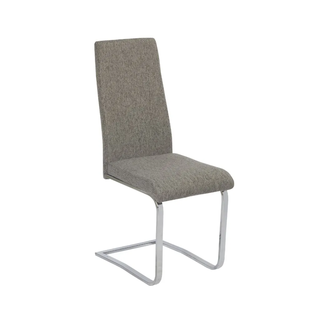La silla de comedor Kamil combina elegancia y comodidad con su tapizado en tela gris oscuro y estructura cromada. Perfecta para comedores modernos.