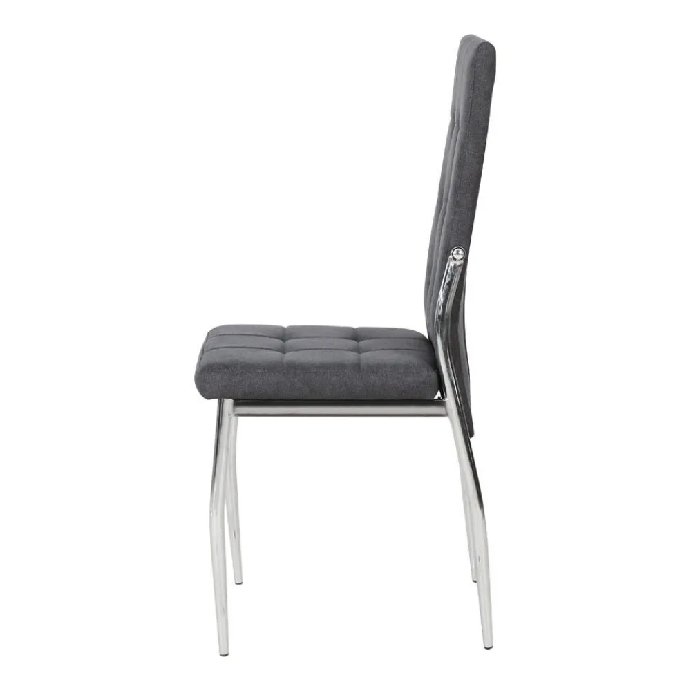 Silla de comedor tapizada en tela color gris y patas cromadas. Con asiento y respaldo acolchados.