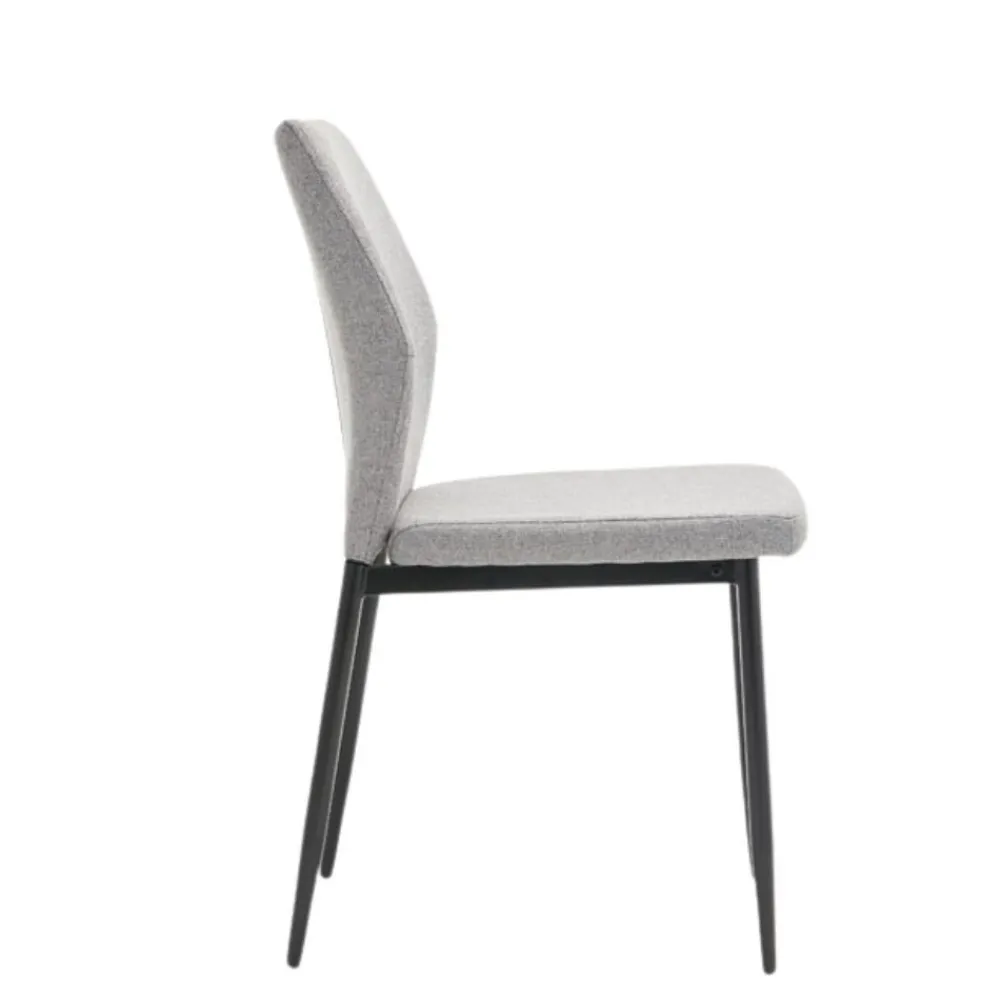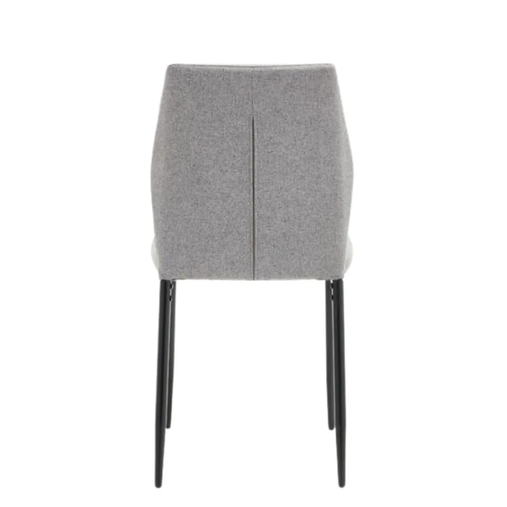 Silla de comedor de estructura metálica en color negro, asiento y respaldo acolchado y tapizados en tela Easy Clean tipo lino color gris, el respaldo, de forma hexagonal, está decorado con costuras decorativas en el frente.