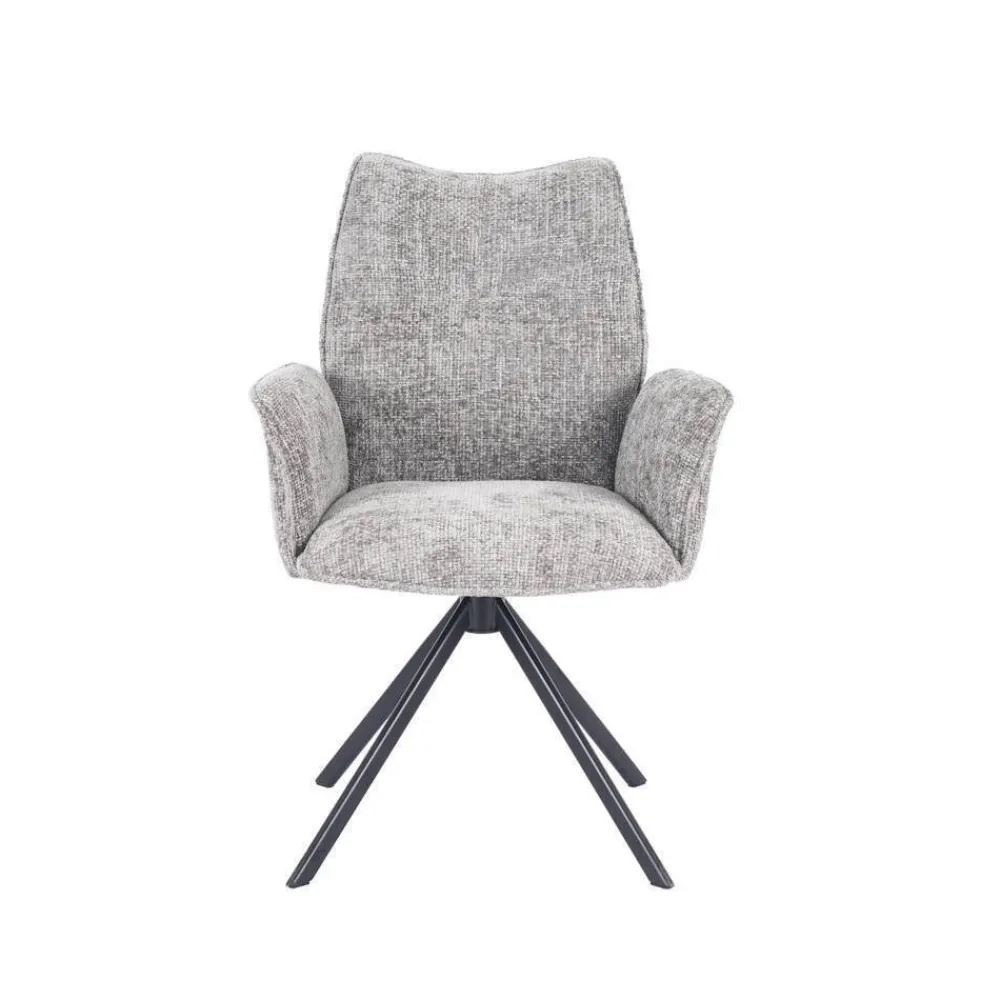 Su tapizado en tela de tono gris elegante y su diseño ergonómico con brazos, te ofrecen comodidad y estilo. Perfecta para un salón o comedor, cuenta con un mecanismo giratorio de 180º con retorno automático, ideal para espacios contemporáneos. Las patas metálicas negras aportan un toque de sofisticación
