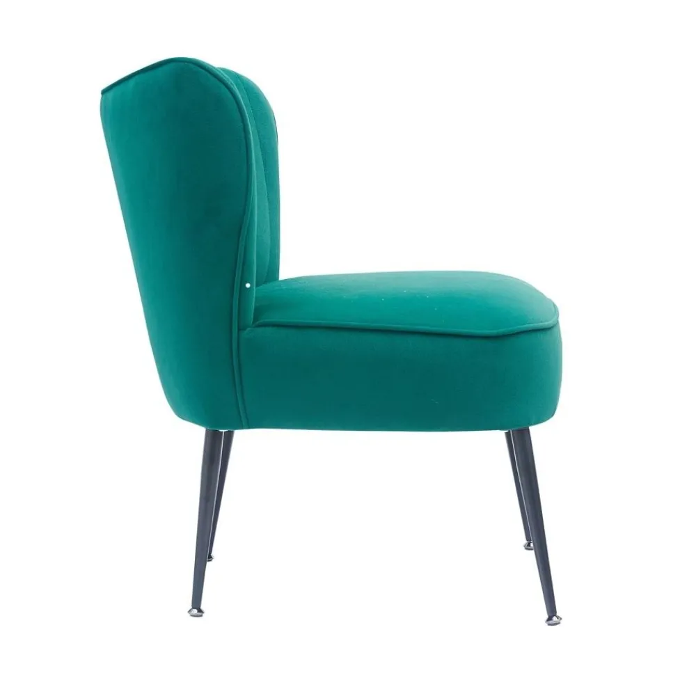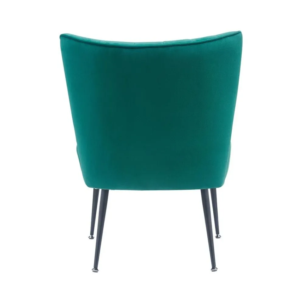Bonita butaca de patas metálicas en color negro, acolchada y tapizada en tela Velvet color verde de tacto similar al terciopelo. El respaldo está decorado con franjas verticales cosidas con hilo del mismo color.