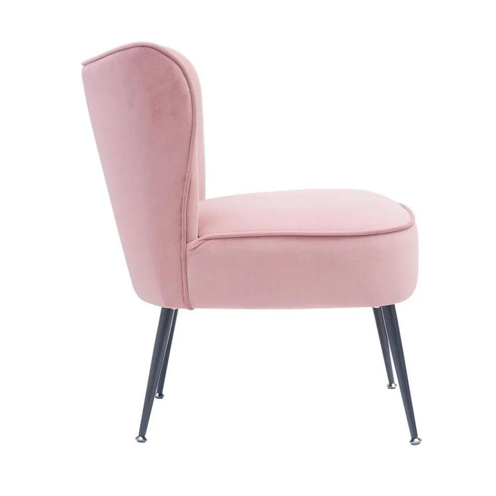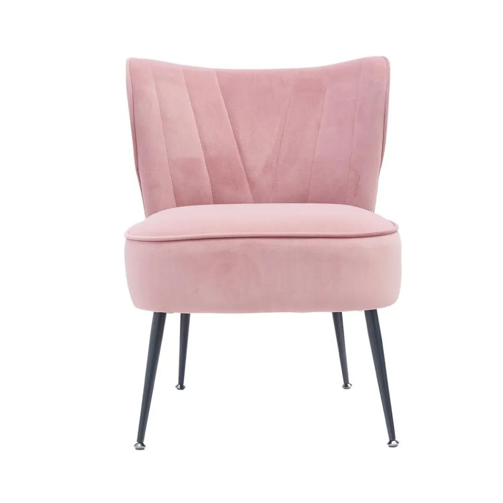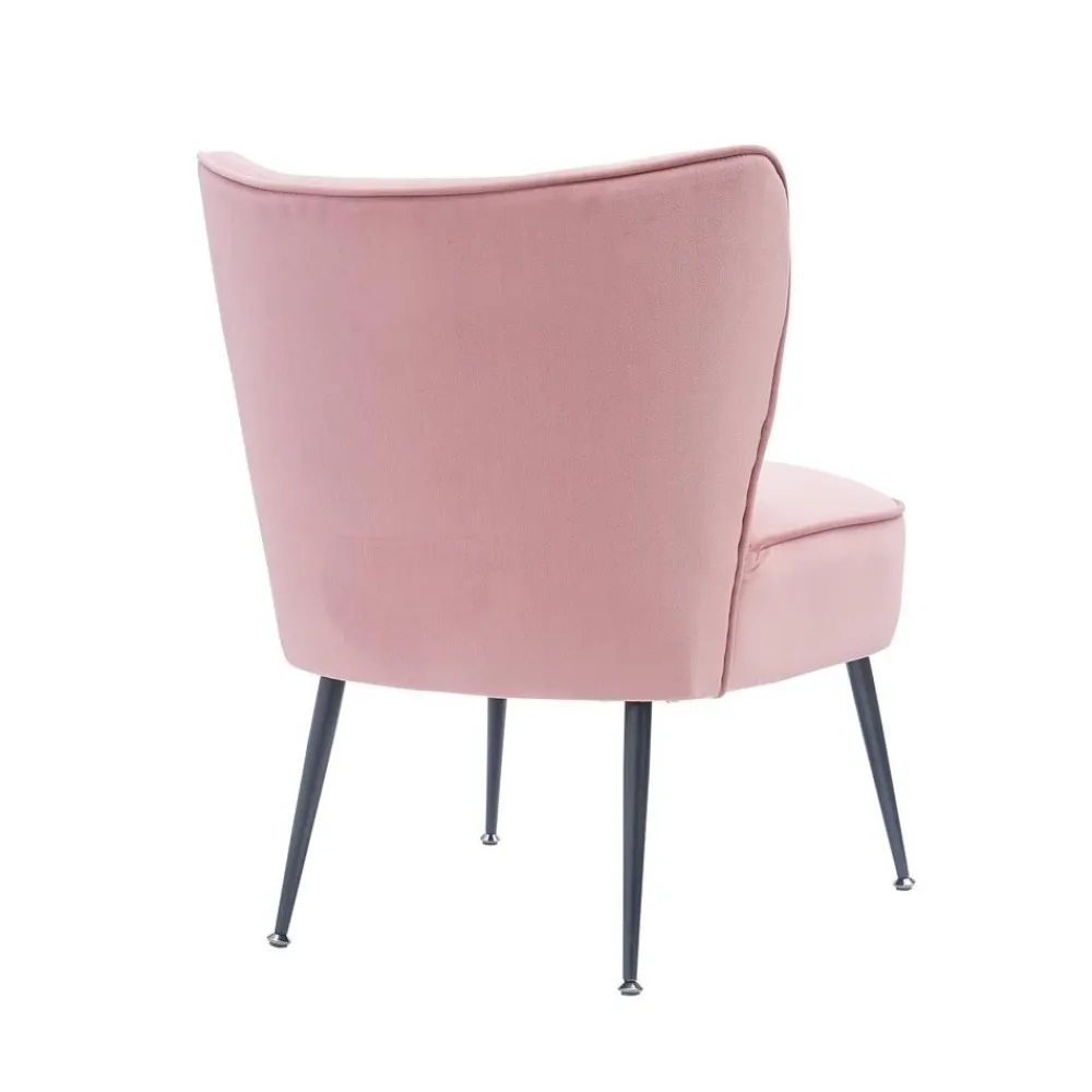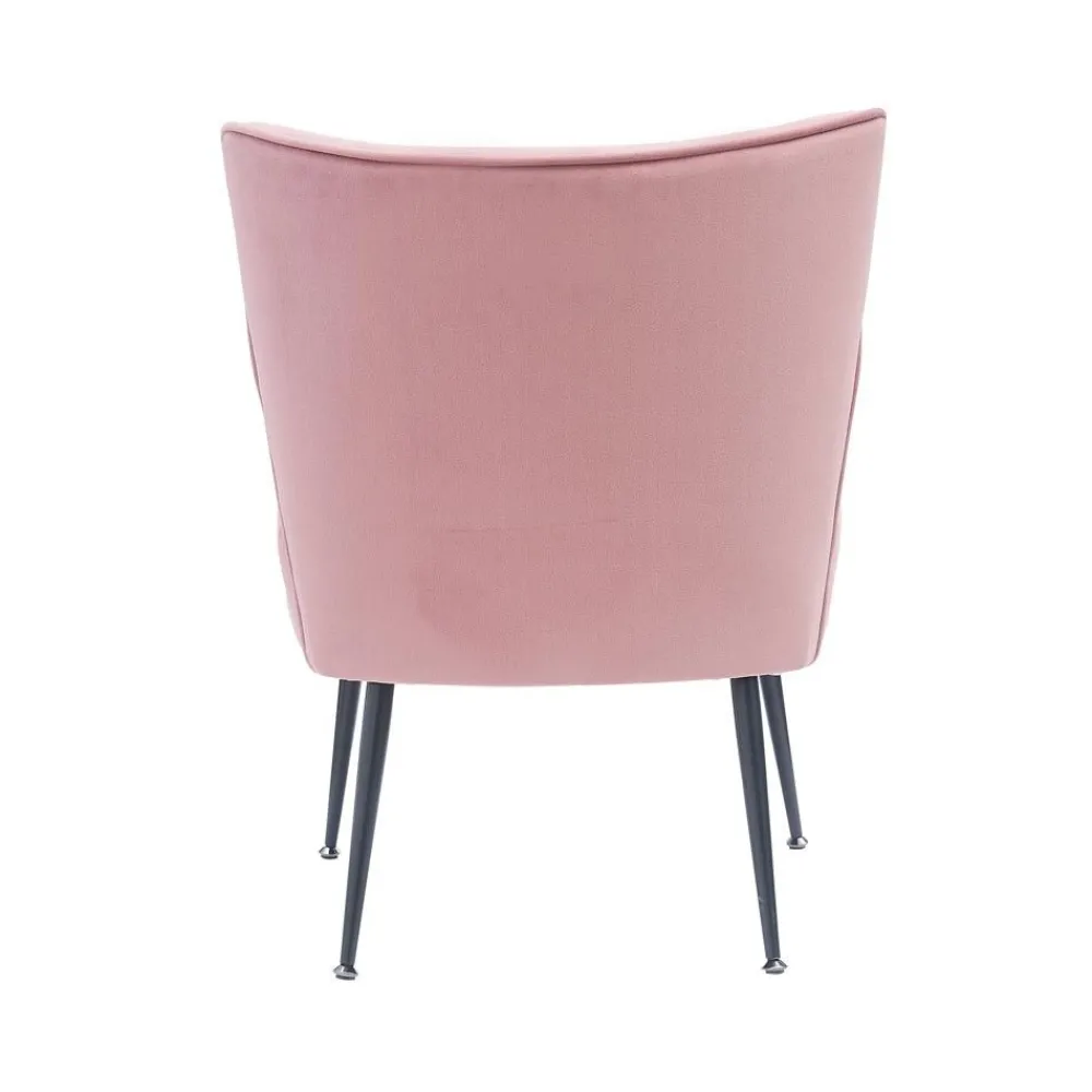 Bonita butaca de patas metálicas en color negro, acolchada y tapizada en tela Velvet color rosa de tacto similar al terciopelo. El respaldo está decorado con franjas oblicuas cosidas con hilo del mismo color.