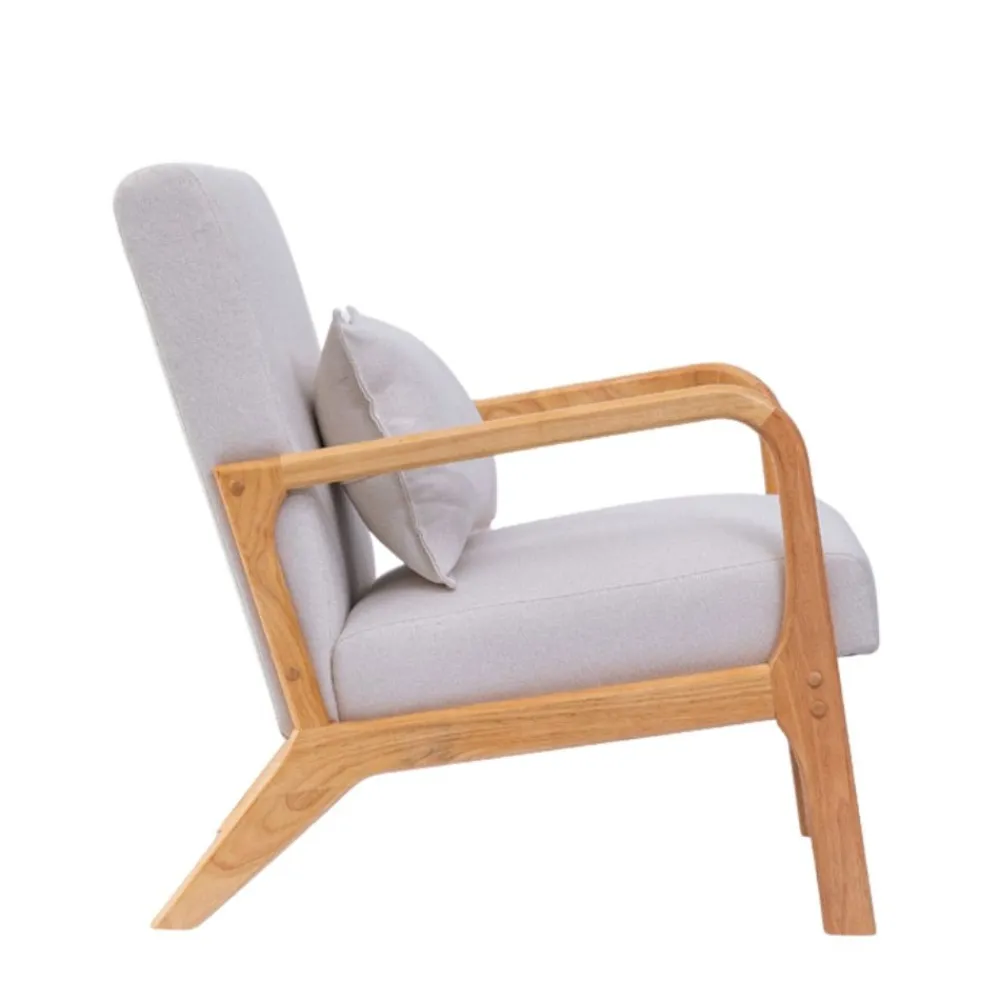 La butaca Roma ofrece un diseño nórdico elegante y funcional con estructura de madera maciza en roble natural y tapizado en tela beige. Incluye cojín lumbar a juego.