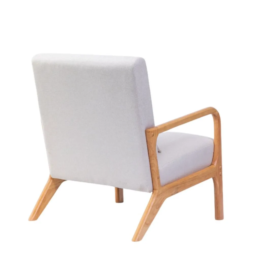 El asiento y el respaldo de la están diseñados para ofrecer el máximo confort. La espuma de alta densidad utilizada en el acolchado asegura que el asiento mantenga su forma y soporte a lo largo del tiempo, mientras que la tela beige es fácil de limpiar y mantener, garantizando que la butaca siempre luzca impecable. Además, la estructura de madera maciza en color roble proporciona una base robusta y estable, asegurando la durabilidad de la pieza.