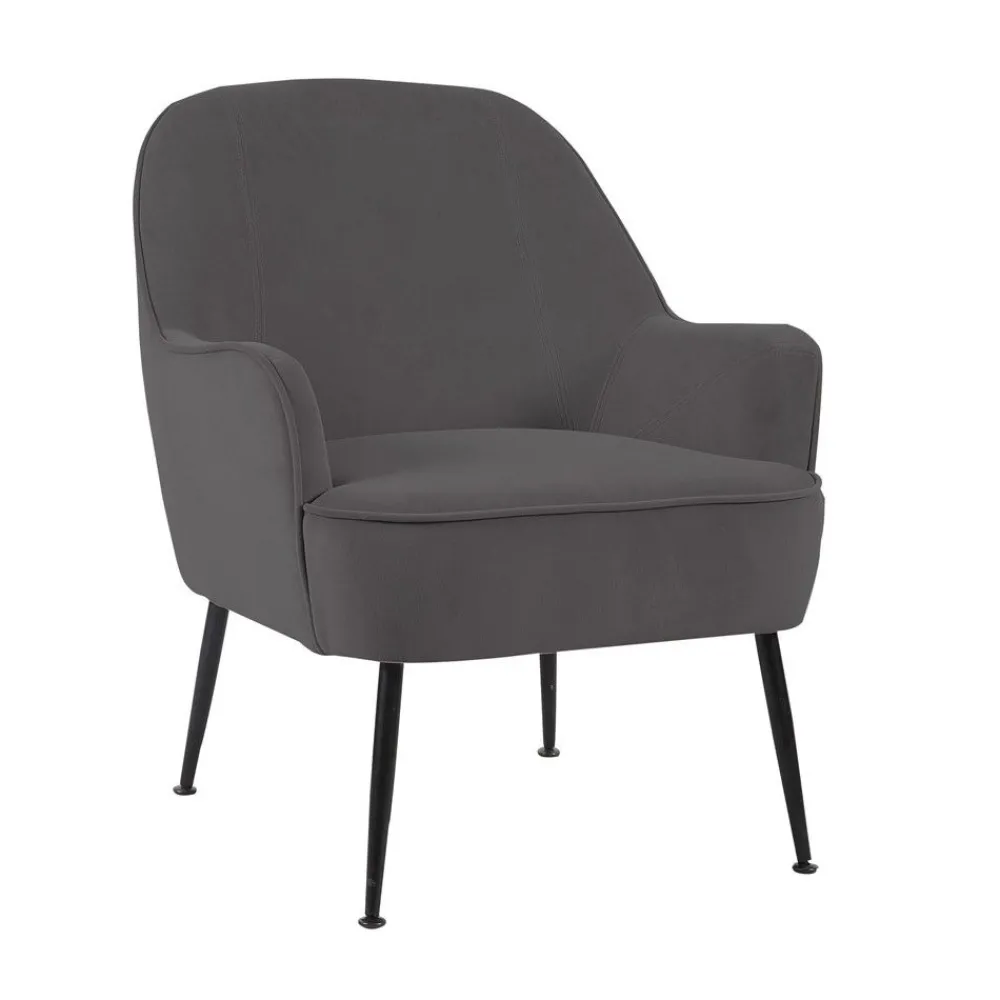 Cómoda butaca tapizada en tela Velvet tipo terciopelo en color gris, el sillón con reposabrazos Badalona Amur destaca por su diseño y precio económico.
