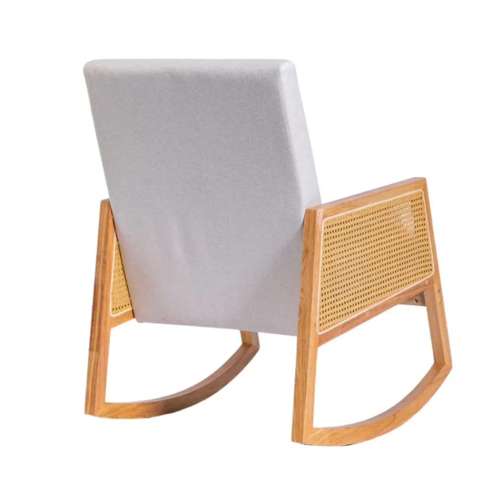 La combina a la perfección el estilo nórdico con funcionalidad y comodidad. Con una estructura robusta de madera maciza en color roble y delicados detalles de ratán en los brazos, esta mecedora es la elección ideal para añadir calidez y un toque natural a cualquier espacio.