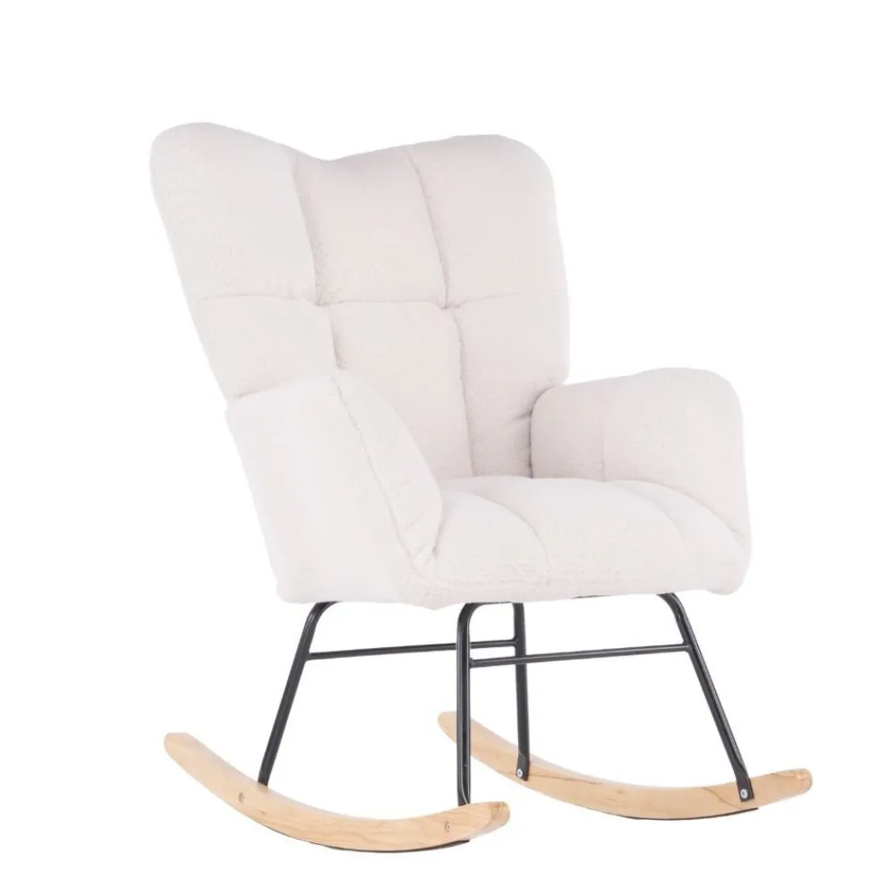 Sillón mecedor tapizado en tela tipo Teddy color blanco, destaca por su respaldo decorado en capitoné y sus dos reposabrazos.