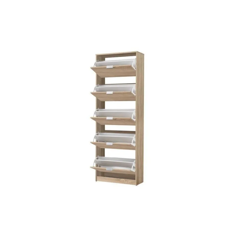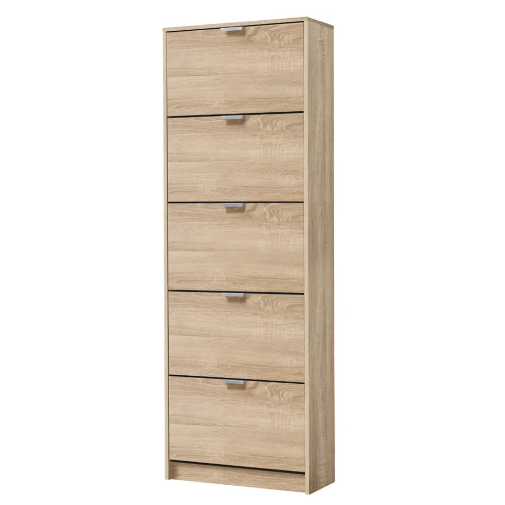 Zapatero de 5 puertas batientes en laminado sintético color roble Sonoma. Tiradores en color aluminio